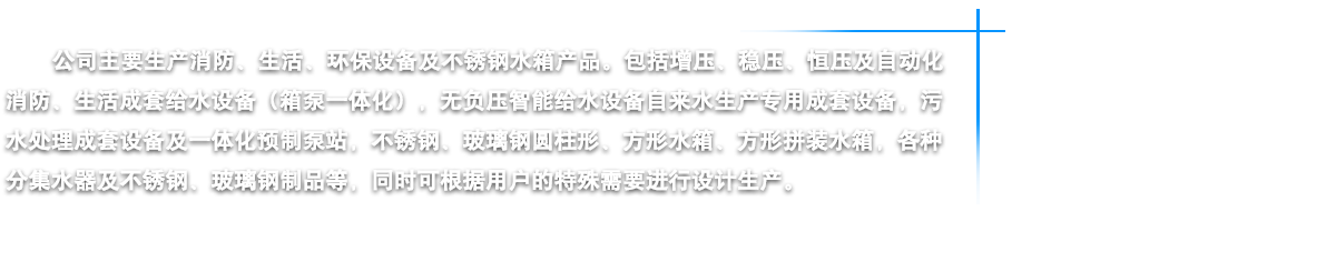 江蘇燁達(dá)環(huán)保設(shè)備有限公司坐落在江蘇省鹽城市建湖縣城,東臨黃海之濱,背倚蘇北平原,處于長(zhǎng)三角經(jīng)濟(jì)一體化和江蘇沿海開發(fā)兩個(gè)國家級(jí)戰(zhàn)略疊加區(qū)域內(nèi),素有“水鄉(xiāng)明珠”美稱。我公司鑒定走“產(chǎn)、學(xué)、研”相結(jié)合的路子,是江蘇省供水設(shè)備行業(yè)的大型企業(yè)。公司以“一流的管理,一流的研發(fā)設(shè)計(jì),一流的質(zhì)量意識(shí),一流的售后服務(wù)”為宗旨,嚴(yán)格控制原材料質(zhì)素,講求“品質(zhì)是企業(yè)的生命力”的理念,嚴(yán)把質(zhì)量關(guān),從而為客戶提供優(yōu)質(zhì)的供水設(shè)備。公司主要生產(chǎn)消防、生活、環(huán)保設(shè)備及不銹鋼水箱四大類產(chǎn)品。包括增壓、穩(wěn)壓、恒壓及自動(dòng)化消防、生活成套給水設(shè)備(箱泵一體化),無負(fù)壓智能給水設(shè)備自來水生產(chǎn)專用成套設(shè)備,污水處理成套設(shè)備及一體化預(yù)制泵站,不銹鋼、玻璃鋼圓柱形、方形水箱、方形拼裝水箱,各種分集水器及不銹鋼、玻璃鋼制品等,同時(shí)公司可根據(jù)用戶的特殊需要進(jìn)行設(shè)計(jì)生產(chǎn)。燁達(dá)人將以科學(xué)的管理、精湛的技術(shù)、可靠的質(zhì)量、優(yōu)良的品質(zhì)向社會(huì)各界服務(wù),我們始終坦誠相見,我們當(dāng)然走在最前面······ |